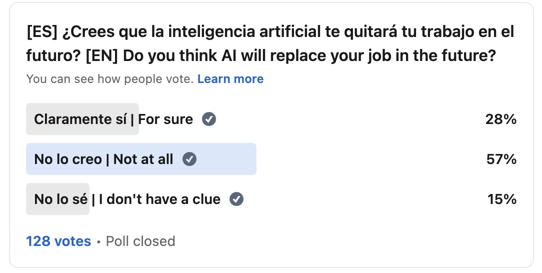 Hace una semana publiqué una encuesta en LinkedIn preguntando si los Tech Recruiters pensaban que la IA les quitaría o no su trabajo.